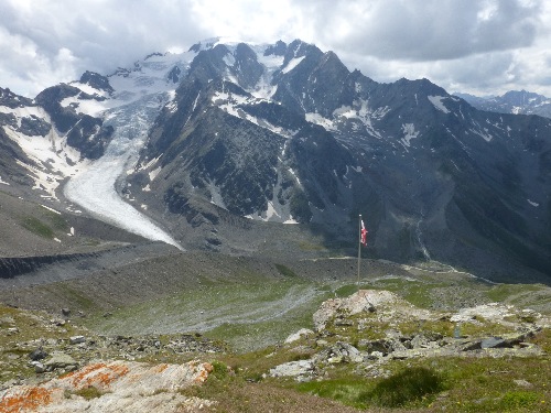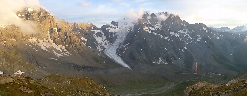 A 1h45, on atteint l’épaule et on bascule sur un autre versant d’où l’on découvre le glacier. Le sentier continue en balcon jusqu’à une bifurcation ; tenir toujours la gauche en direction de la cabane Valsorey (sur la droite encore une possibilité de rejoindre la cabane de Velan).