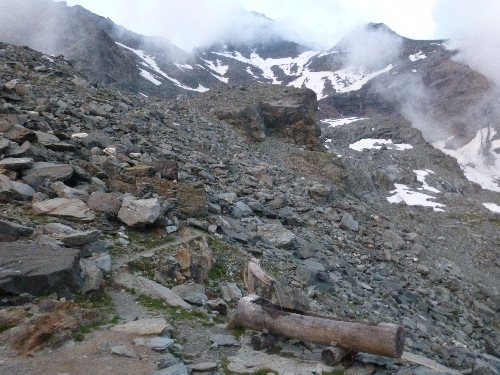 A 2h15, on atteint un grand replat (Grands Plans 2529m) d’où l’on aperçoit la cabane perchée sur son rocher, avec en point de mire la face sud ou envers du Grand Combin. Il vous faudra encore plus d’une heure pour atteindre la cabane après une dure montée en pente raide (400m de dénivelé).