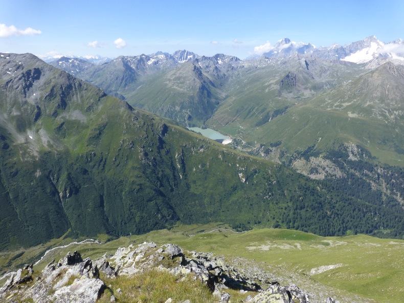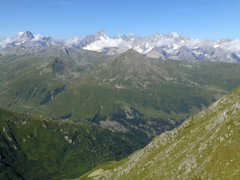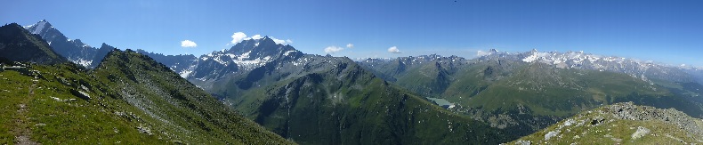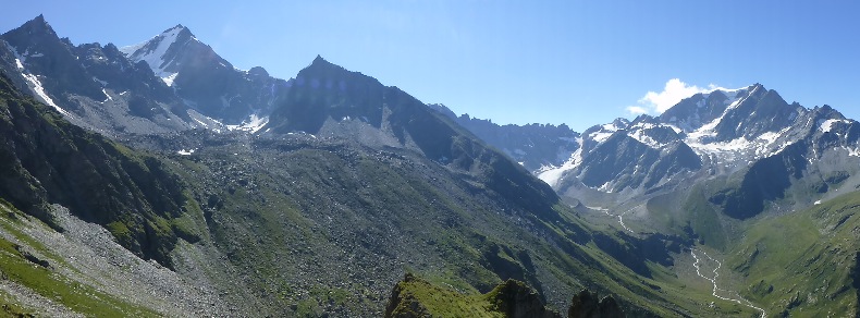 Vous pouvez pique-niquer ici car après vous changerez de versant et vous n’aurez plus la vue exceptionnelle à 180° qui vous accompagne depuis le départ ce matin sur les glaciers et la chaîne des Alpes.