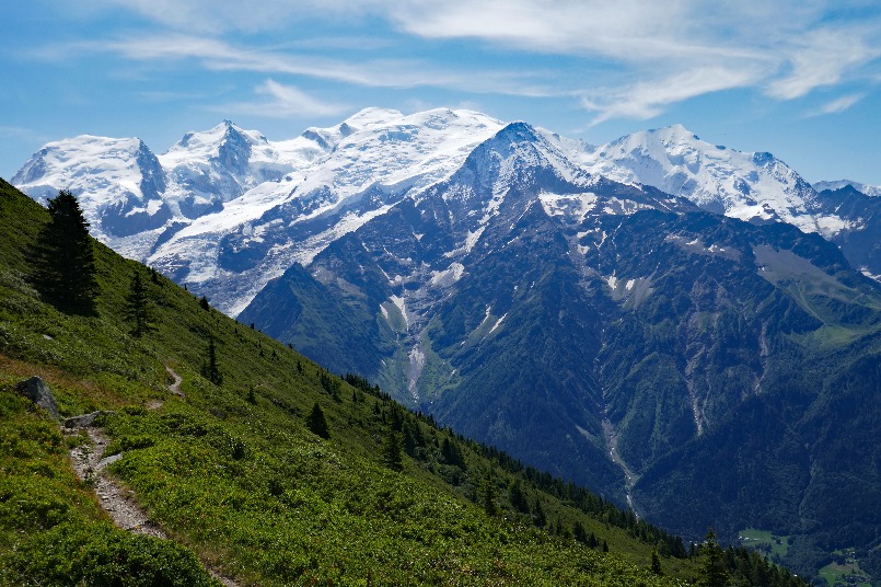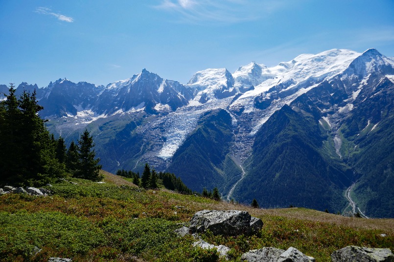 Vers 1800m, la forêt devient plus clairsemée et apparaissent les premiers rhododendrons. A 1900m, on sort de l’étage forestier juste avant de rejoindre l’alpage de Chailloux avec son troupeau de moutons. Une des plus belles vues sur tout le massif du Mont-Blanc juste en face de vous, depuis la Verte, les Aiguilles de Chamonix, Aiguille du Midi, Mont-Blanc du Tacul, Mont Maudit, Mont-Blanc, Dôme du Goûter, Aiguille de Bionnassay, Dômes de Miage.