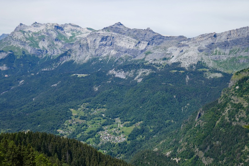 On rejoint Les Pontets (1550m), belle clairière avec vue sur la Chaîne des Fiz et des Aravis, Passy, Plateau d’Assy, sur la gauche le Prarion et derrière le Mont-Joly qui dépasse.