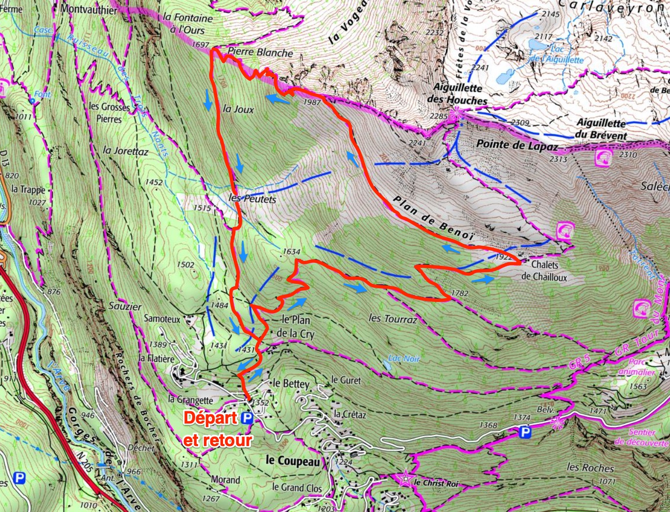 Prendre la direction de Plan de la Cry par le sentier. On rejoint les chalets de Plan de la Cry (1430m) en 15mn. Un panneau indique Chalets de Chailloux à 1h25 (temps un peu large, compter 1h15). On arrive rapidement à une bifurcation avec 2 sentiers qui mènent à l’Aiguillette des Houches, celui de gauche en passant par Pierre Blanche et celui de droite en passant par les Chalets de Chailloux. Prendre à droite (vous reviendrez par le sentier de gauche) et suivre le sentier qui serpente dans la forêt en pente continue modérée jusqu’aux Chalets de Chailloux. Le sentier offre quelques vues en trouée sur Les Houches, le plateau du Prarion, Col de Voza, Bellevue, le Mont Lachat, Col du Tricot et sur la droite le Mont Joly.