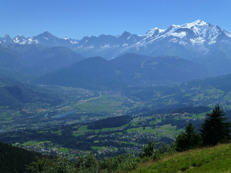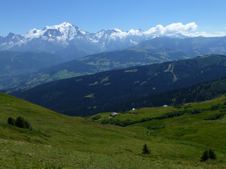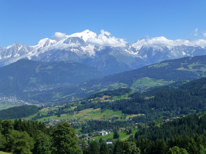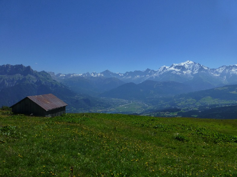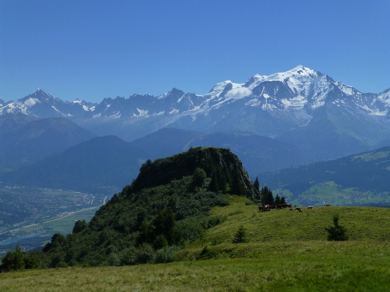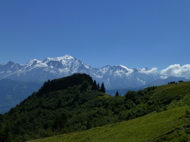 Après 45mn, vous sortez de la forêt, pâturage et vaches. Encore 5mn et vous arrivez à un premier chalet d’alpage avec superbe vue à 180°. Faites une pause bien méritée. Superbe vue sur Passy, Sallanches, Megève, toute la chaîne du Mont-Blanc des Aiguilles de Chamonix aux Dômes de Miage.
