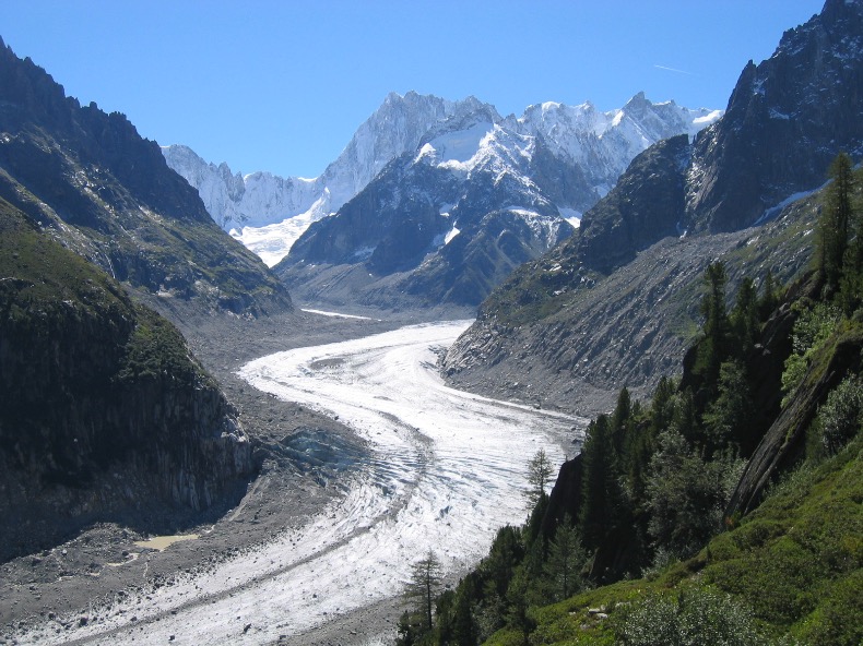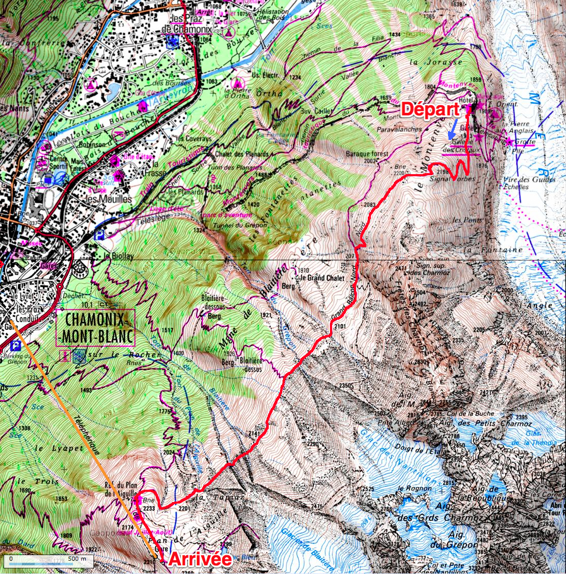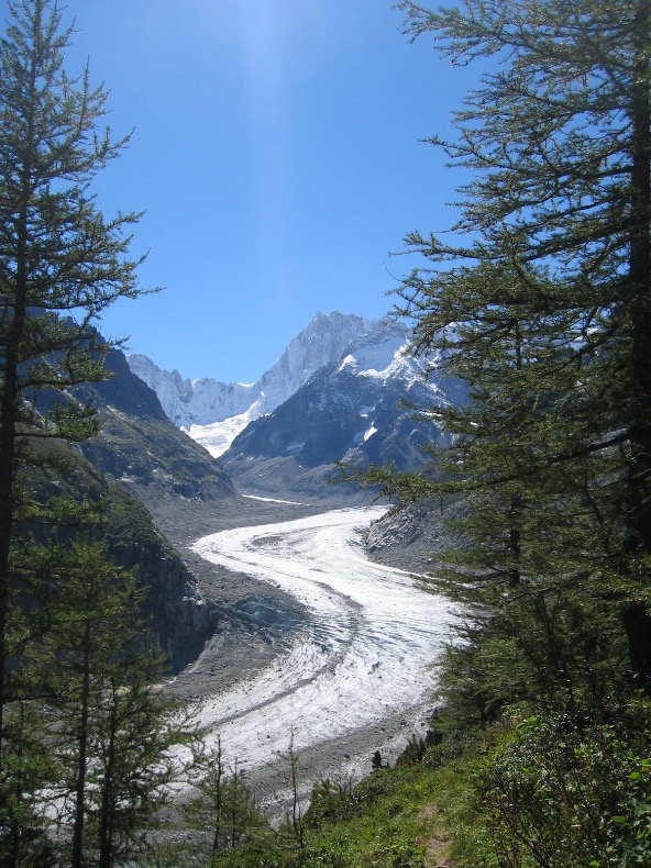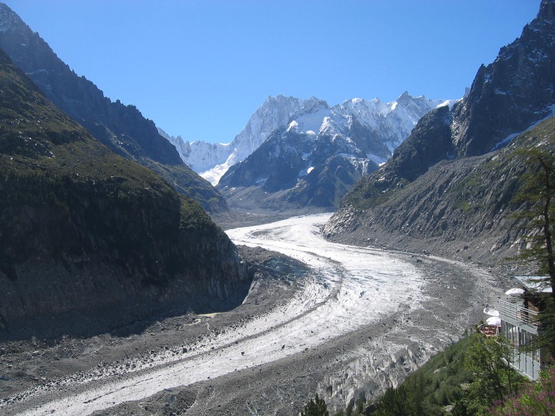 Depuis l’arrivée de la gare du téléphérique de l’Aiguille du Midi, on rejoint la gare du Montenvers d’où l’on est parti le matin en 10mn à pied, par le centre de Chamonix.