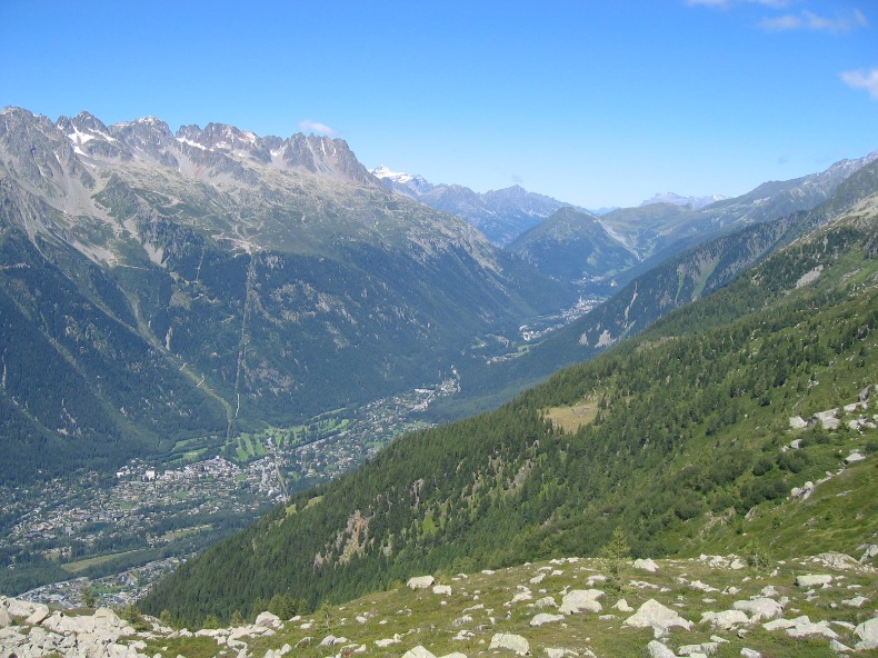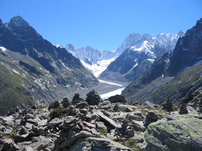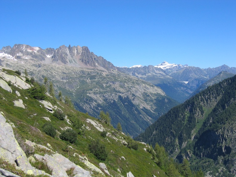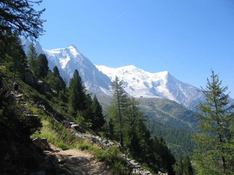 Le sentier chemine ensuite d’une manière évidente pratiquement en balcon sous les Aiguilles de Chamonix, face à l’Aiguille du Midi et au Mont-Blanc, entre pelouses et blocs de pierre laissés là par un ancien glacier.