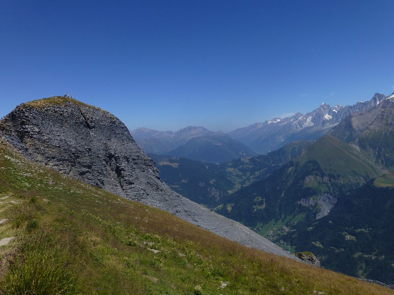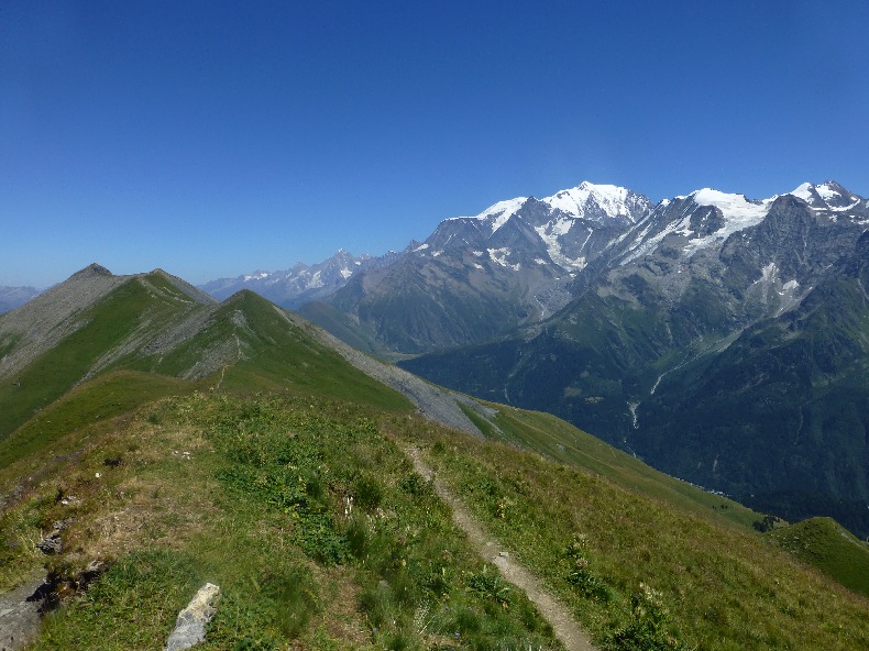 Pour le retour, empruntez le chemin de crête en sens inverse jusqu’à La Combaz. Poursuivez la crête jusqu’à la Tête du Veleray (2452m) et enfin jusqu’au pied de l’aiguille Croche que l’on rejoint en moins d’une heure et demi. A noter que le chemin de crête entre la Tête du Velerey et l’Aiguille croche est plus étroit et indiqué comme « passage délicat » donc soyez vigilent). Pensez à vous arrêter pour regarder le paysage grandiose, n’oubliez pas que vous marchez sur une crête. Vue plongeante sur l’altiport de Megève d’un côté, toujours la chaîne du Mont-Blanc de l’autre.