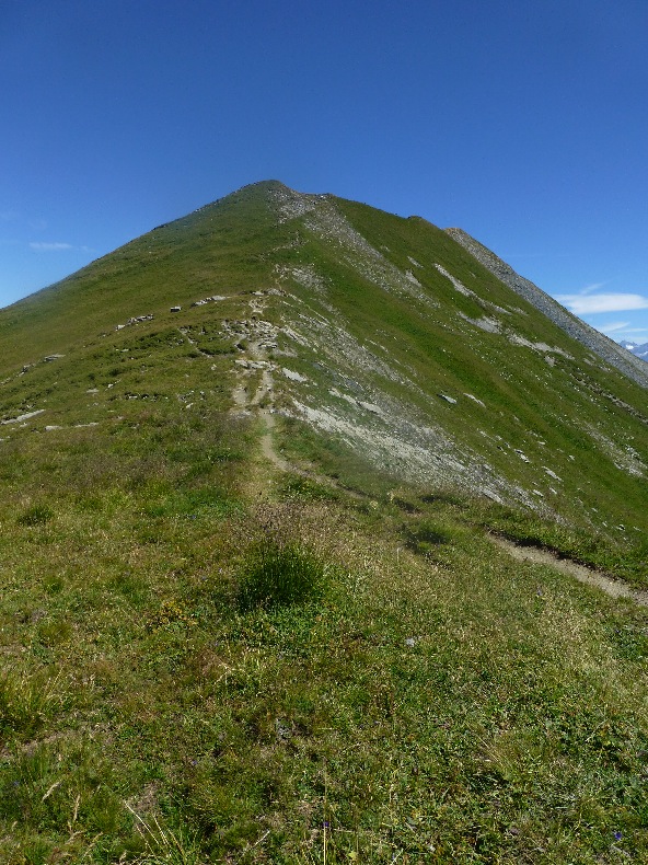 Le sentier s’élève ensuite en pente raide à découvert dans les herbages et traverse les lieux-dits La Tappée avec son abreuvoir (1630m) et Pré Conduit (1830m) que l’on rejoint en 1h de marche environ depuis le départ. Prendre à l’intersection le sentier à droite fléché Tête de la Combaz/Mont-Joly.