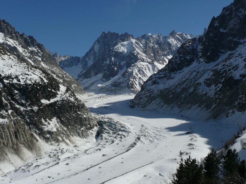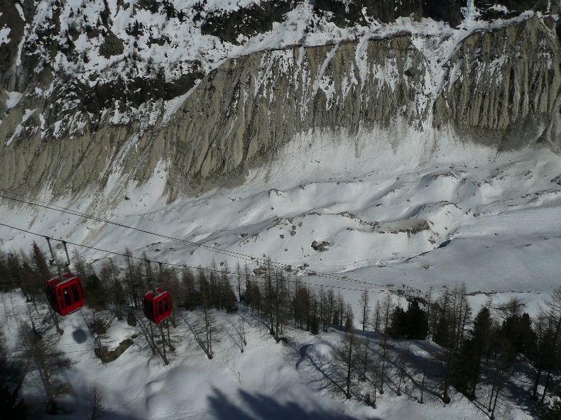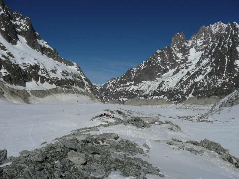 Depuis le sommet de l’Aiguille du Midi, descente de 23km jusqu’à Chamonix, pause déjeuner possible au Refuge des Requins, retour suivant enneigement par train du Montenvers