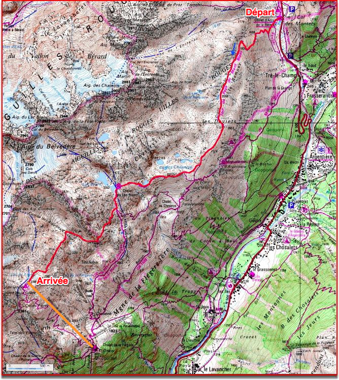 Le retour par Tré les Champs emprunte le même sentier depuis le Lac Blanc puis à la hauteur des lacs des Chéserys, laisser le sentier emprunté à la montée sur la gauche (direction col des Montets) pour prendre celui à droite en direction de Tré-les-Champs. Au niveau de l’Aiguillette d’Argentière (1893m), on franchit des falaises granitiques grâce à un passage équipé (une main courante sur rocher + échelles). On poursuit la descente dans une forêt de mélèzes vers Plan de la Grange et Tré-le-Champ-le-Haut. Le sentier sur la gauche rejoint le chalet d’accueil du col des Montets.