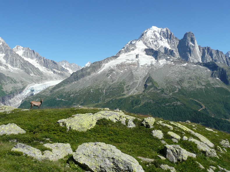 À 2h, on atteint une bifurcation ; on laisse la direction d’Argentière/Flégère pour suivre celle du Lac Blanc/Lacs des Chéserys. On est au cœur de la carte postale, le panorama est toujours le même avec les Jorasses et le Mont-Blanc en plus.