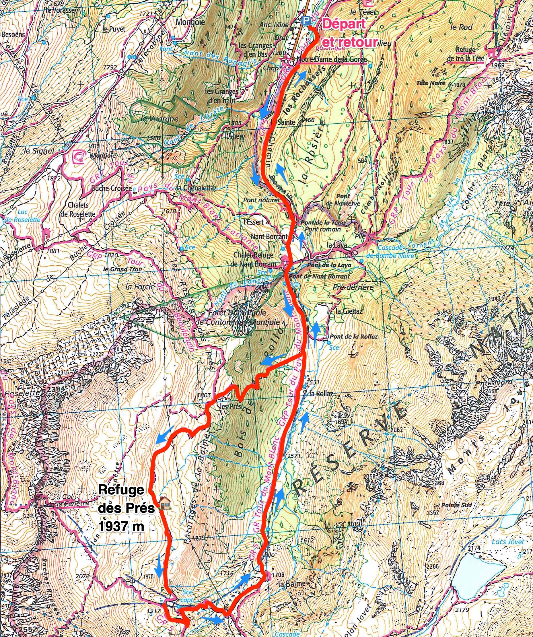 On passe devant le chalet refuge du Nant-Borrant. Au bout de 50mn, on atteint la bifurcation «·La Rollaz·» (1535m). On quitte la voie romaine par un sentier sur la droite. Le refuge des Près est indiqué à 1h25.