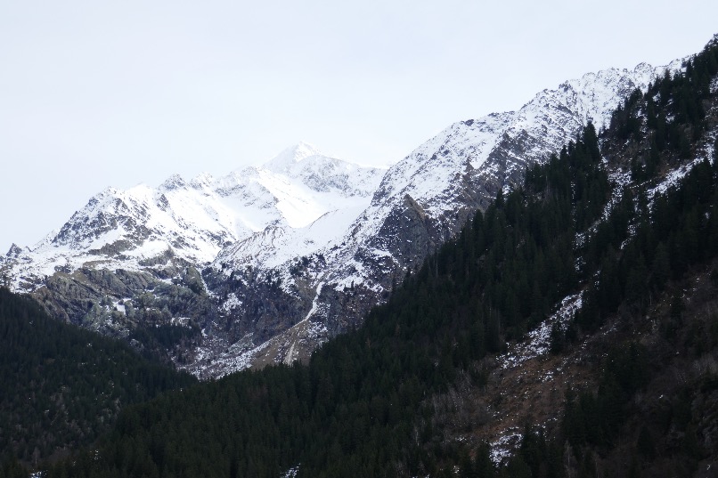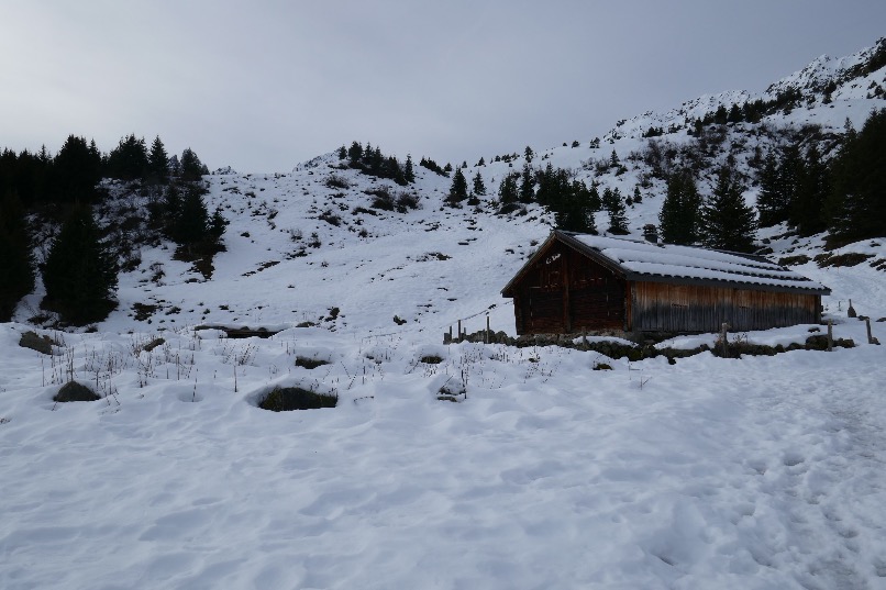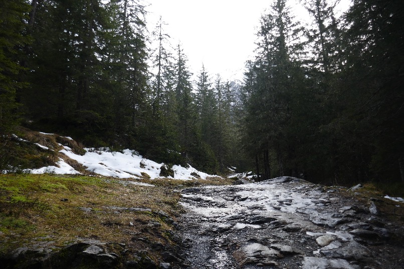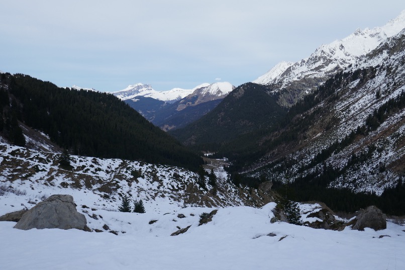 On emprunte le même chemin qu’en été. Sur la rive droite du torrent, l’ancienne voie romaine s’élève rapidement à travers la forêt, direction Col du Bonhomme (TMB), le refuge des Prés est indiqué à 2h25.