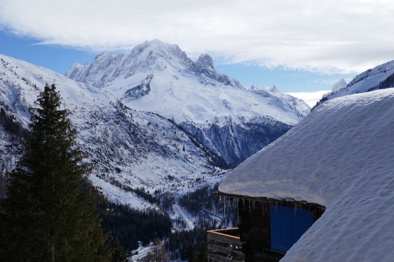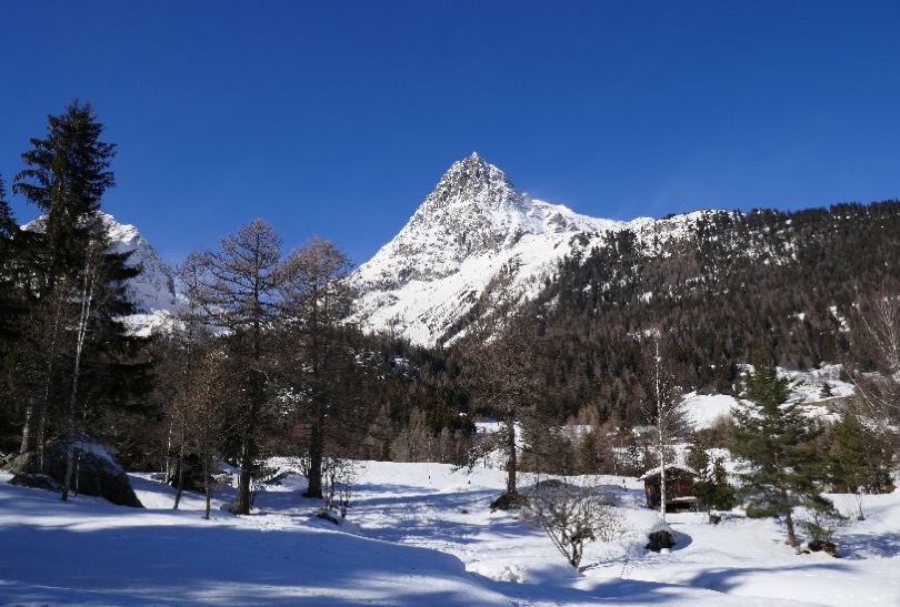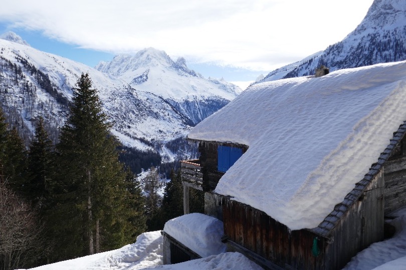 Traverser Les Granges, on aperçoit sur la gauche le glacier d’Argentière.