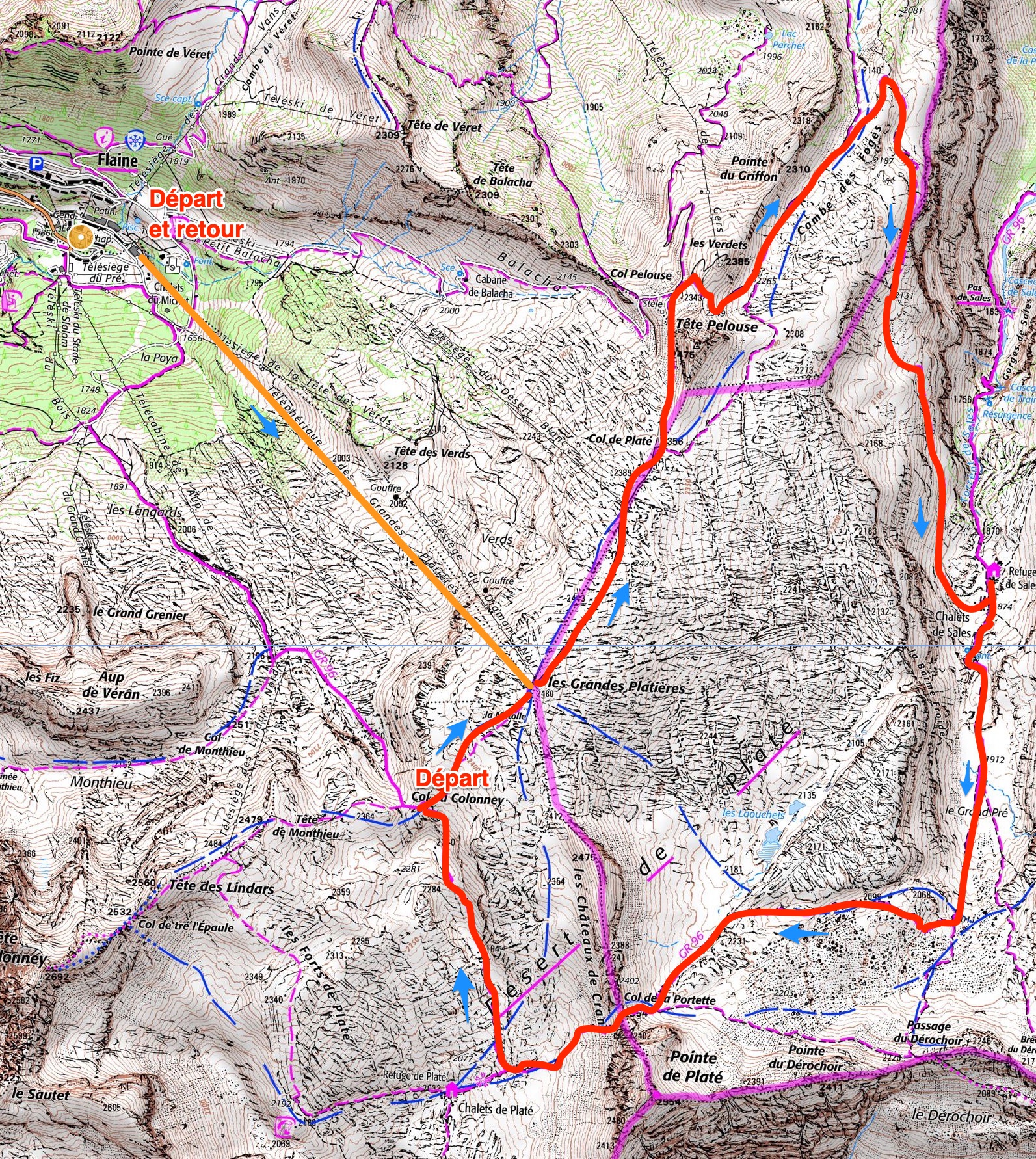 Dénivelé : 2480 m à 1877 m (Refuges de Sales) à 2354 m (Col de la Portette) à 2032 m (Refuge de Platé) à 2480 m (Les Grandes Platières) soit +925 m