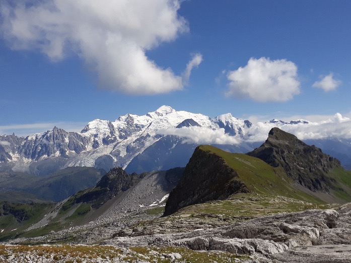 Emprunter la télécabine des Grandes Platières. A la sortie de la télécabine (2480m), table d’orientation. Vue exceptionnelle sur la chaîne du Mont-Blanc de l’Aiguille Verte aux Dômes de Miage, mais aussi la chaîne des Fiz et le Mont-Buet. Ne pas trop s’attarder car il y a du chemin…