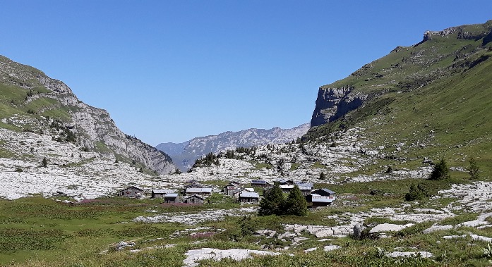 A 1h15 du départ, on arrive à Pierre Carrée (2120m), belle vue sur les chalets de Sales en contrebas.
