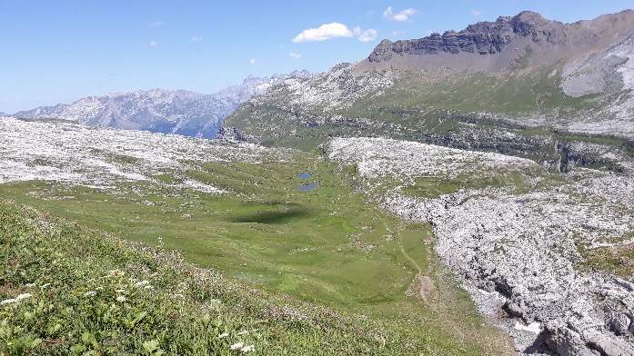 En 30mn, on arrive « Au-dessus du Col » (2310m). Contourner par derrière la Tête pelouse puis rejoindre en 10mn « Combe des Foges amont » (2265m). Descendre dans la combe où il y a souvent un troupeau de moutons gardé par un patou.