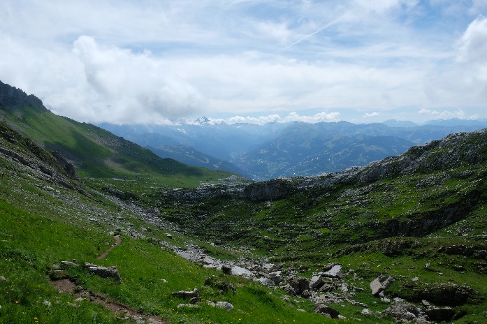 Après 50mn de descente, on atteint une bifurcation ; laisser le sentier qui continue vers le refuge de Platé (indiqué à 5mn, vous pouvez faire un aller-retour jusqu’au refuge si vous êtes dans les temps, très belle vue sur la vallée de Sallanches) et prendre sur la droite pour remonter en direction de la télécabine des Grandes Platières (indiquée à 1h20).