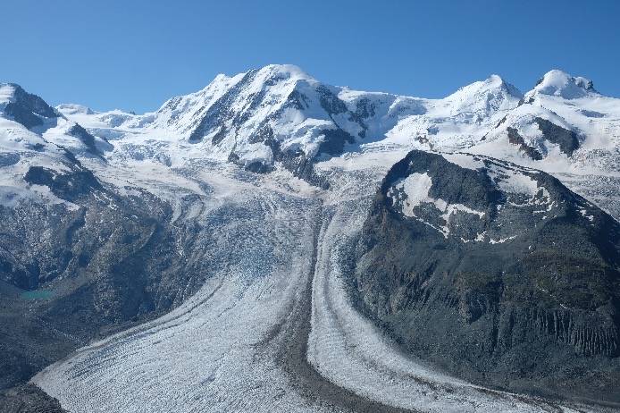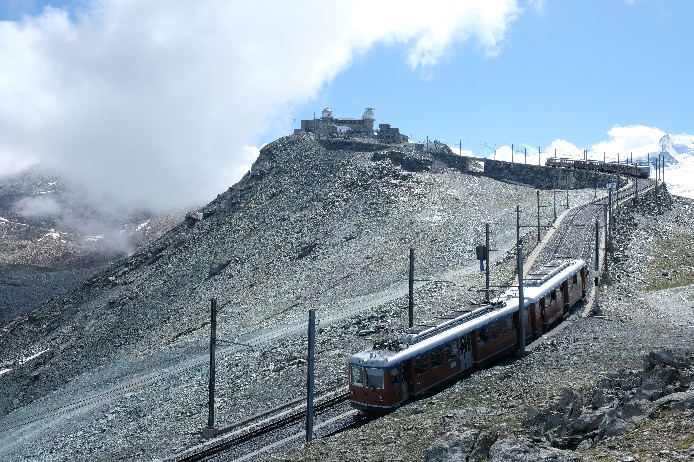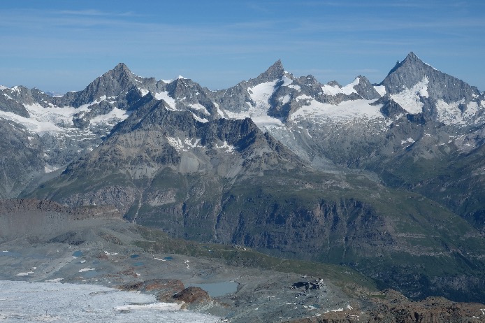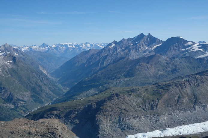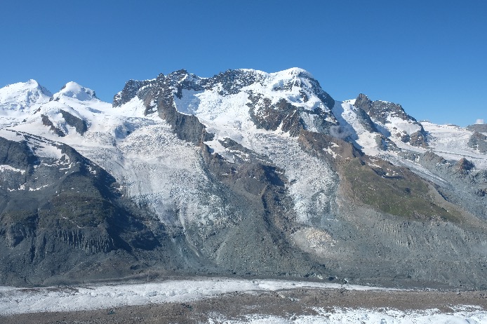 Gonergrat, par le chemin de fer à Crémaillère (30mn de train), plateforme panoramique à 3089m sur 29 sommets de plus de 4000m dont juste en face de vous le Mont-Rose avec la pointe Dufour (4634m), le Liskamm (4527m), Castor (4228m) et Pollux (4092m) et le Breithorn (4164m).